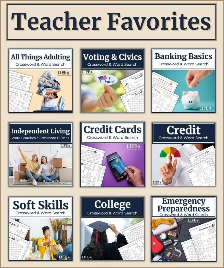 These aren’t fluff. They cover the words and concepts students need for life after high school: opening a bank account, reading a lease, building credit, filing taxes, and more. Word searches and crossword puzzles let students practice the language of adulthood in a format they enjoy.